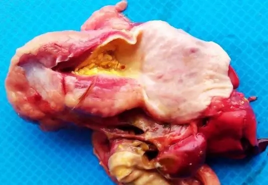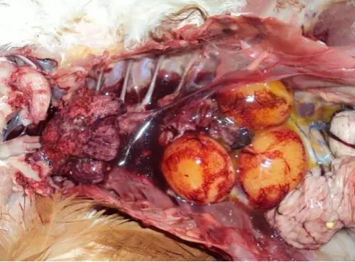 剛死不久的雞體溫很高,觸摸感到燙手,有人曾把溫度計插入雞的胸肌中測其溫度可達50-60℃。病死雞顱骨有出血點,肺部嚴重淤血,胸腔、心臟周圍組織呈灰紅色出血性浸潤,腺胃黏膜自溶,胃壁變薄,可擠出灰紅色糊狀物,多見腺胃穿孔。(如圖3、圖4)